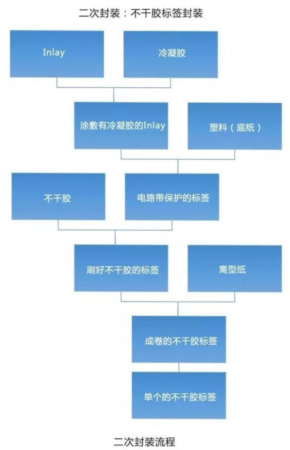 传统的自粘不干胶电子标签用标签复合设备完成封装加工过程。标签结构由面层、芯片线路(Inlay)层、胶层、底层组成。面层可以用纸、PP、PET作覆盖材料(印刷或不印刷)等多种材质作为产品的表面,应用涂布设备将冷凝胶涂敷到Inlay层上,再加上塑料材质的底油,通过与印刷好的上下底料相结合,形成大张的成品标签卡,再通过印刷、层压、冲切等形成符合ISO-7810卡片标准尺寸,也可按需加工成异形等形式,。一次封装流程纸,就型成电路带保护的标签,再刷上胶,和离型纸结合,就形成了成卷不干胶电子标签,再经过模切等工序,就形成了单个的不干胶电子标签。