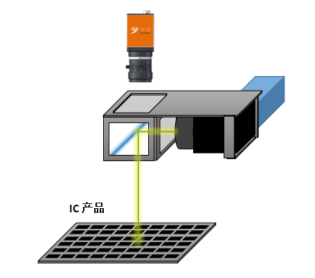 激光打标系统采用伪同轴结构,由半透半反棱镜将侧面射出的激光折射90°,垂直向下。CCD从上往下拍摄,透过半透半反棱镜拍摄CCD下方的IC产品,进行图像分析定位。相机将计算出的像素坐标转换为激光器的物理坐标,控制激光器振镜偏转实现定位打标。
