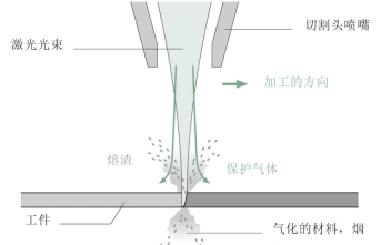 图:激光使材料蒸发,燃烧。蒸气的压强使熔渣从切口排出