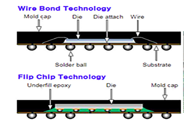 随着电子产品的发展趋向微型化、薄型化、高性能化,IC封装也趋于微型化、高度集成化方向发展。如图显示了倒装芯片和引线键合封装内部结构的比较。倒装芯片表示将带有焊料凸块的芯片的图案化面翻转以直接互连到带有焊球的基板,在引线键合封装中,长导线连接在芯片和基板之间。倒装芯片技术中的短互连比长线连接更有利于制造更薄更小的集成电路系统并提高电气性能。