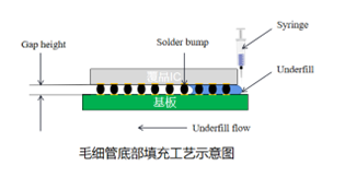 以Underfill为例,在CSP、BGA、POP、Flip chip等工艺中中底部填充是封装技术中关键的工艺流程之一。简单来说,底部填充工艺(underfill)是将环氧树脂胶水点涂在倒装晶片边缘,液体通过气液界面处的毛细作用渗透到狭窄的间隙中,这一过程称为微毛细管流动。倒装芯片封装中,将底部填充环氧树脂填充到芯片和基板之间的间隙中,以防止焊料凸点上的裂缝和热疲劳导致的电气故障。硅芯片和有机基板之间的热膨胀系数 (CTE) 的巨大差异可能会在热循环期间对互连造成显着的热应力。因此,底部填充环氧树脂可通过 CTE 失配缓解应力,并减少基板的冲击和变形,以及保证焊点的可靠性。