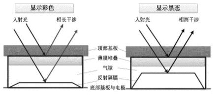 干涉调制显示(IMOD)是由Iridigm DisplayCorporation(之后并入Qualcomm公司)提出后而为大家所熟知的一种显示技术,即Mirasol显示。IMOD的关键结构是可以调节的光学微腔,类似于法布里-珀罗标准具,由独立的金属反光膜与薄膜堆叠形成的半透半反膜形成一个微小的平行反射镜。其中,金属反射膜位于下部,是可变形的。在两层薄膜间施加电压,可使下部金属反射层隆起,进而改变两层薄膜间隙。如图1所示,当环境光入射到微结构中,光线会受到底部金属反射膜及上层薄膜堆叠的半透半反膜的反射。根据需要的波长选择两层薄膜间隙的高度,对于特定的波长,底层金属反光膜反射的光线与上层堆叠结构反射的光线存在微小相移动。根据相位差的不同,某些波长将发生相长干涉,另一些发生相消干涉。通过增强的干涉,人眼会接收到特定波长的一种颜色,包括红色、绿色和蓝色。而相消干涉会导致一个黑态,产生黑色。按照这种方式,通过施加驱动电压可以选择性地控制显示的颜色。