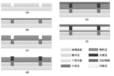 图2 IMOD器件TFT-LCD兼容的背板工艺制作流程。(a)图案化后的缓冲层和下部电极层;(b)沉积介质层;(c)图案化后的牺牲层;(d)图案化后的支撑层;(e)沉积反射隔膜层;(f)剥离牺牲层。