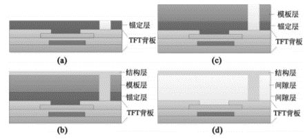 在3种MEMS加工工艺中,由于体硅微机械加工工艺需要双面光刻机及键合技术等,LIGA工艺需要X-Ray曝光机,因而不能与TFT-LCD工艺兼容。而表面微机械加工工艺简单,易于与TFT-LCD工艺兼容,因而得到广泛应用。本文所介绍的基于MEMS辅助的显示工艺,皆以表面微机械加工工艺为基础。