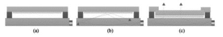 FTIR显示的基本原理是:光通过一种薄的平面透明波导从边缘注入,在波导内发生镜像反射。活性层与导光板之间靠粘合剂粘贴,会有轻微的分离。当活性层被压缩时,棱镜会接触到导光板。由于受抑实现全内反射效应,此时导光板内的光会从导光板逃脱,形成开态;若棱镜回到正常的位置,导光板再次捕获光,形成关态(图6)。