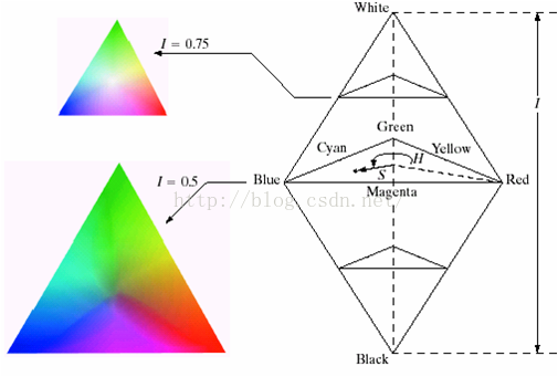 HSI模型的建立基于两个重要的事实: ① I分量与图像的彩色信息无关;② H和S分量与人感受颜色的方式是紧密相联的。这些特点使得HSI模型非常适合彩色特性检测与分析。