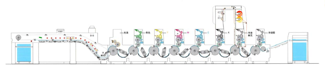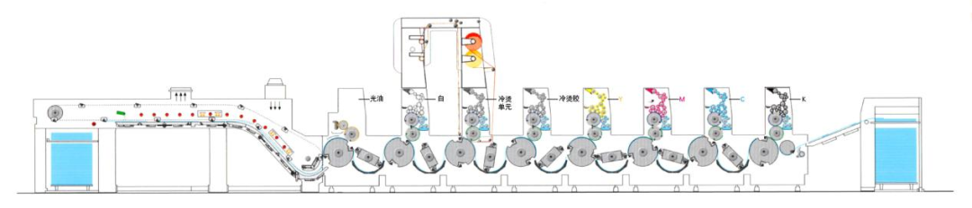 如在前面印刷完未完全干透的4色墨上(中间座4色后仅有一支UV灯管进行预固化)再印刷冷烫胶黏剂,因胶黏剂的黏度一般很大,胶黏剂是否会反拉前面的色墨、经过冷烫座压印时整体墨层是否会被反拉破坏、冷烫箔剥离是否完整、冷烫胶黏剂的透明性是否会对4色图案的透底产生影响等情况都未知。