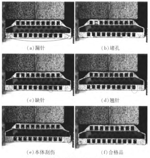 根据生产实际统计,连接器缺陷特征主要包括:① 漏针:本体槽内无针,金属物缺失;② 堵孔:本体槽内填充有异物,针被遮挡;③ 缺针:个别本体槽无针;④ 翘针:针弹起高度超过允许值;⑤ 本体刮伤:本体端面受机械损伤。