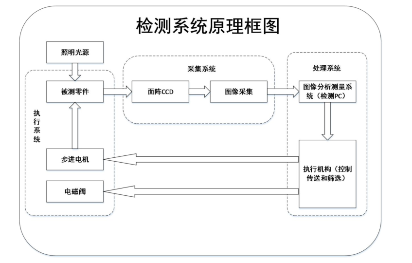 检测原理如下:在照明系统、图像采集系统和运动控制系统的帮助下获取图像,把获取到的电子连接器图像信号传输到PC机,在PC上进行图像处理与检测,完成缺陷检测任务,将检测结果在显示器上进行显示,并传动给执行单元执行相应的操作。
