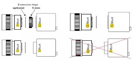 所有的摄像机镜头均是螺纹口,CCD摄像机的镜头安装有两种工业标准,即C安装座和CS安装座。两者螺纹部分相同,但两者从镜头到感光表面的距离不同。