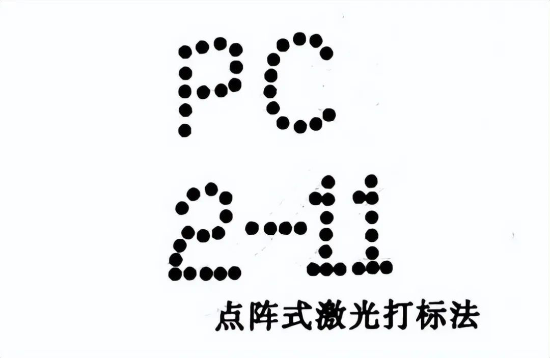 用一台或几台小型激光器同时发射光脉冲,经反射镜和聚焦透镜后使一个或多个激光脉冲在工件表面上烧蚀出形状均匀而细小的凹坑(凹坑的直径一般为$15pm),激光打出标记的字符和图案都是由多个小圆凹坑点构成。一般竖向的笔画最多为七个点,横向笔画最多为五个点形成7x5阵列,如下图所示。