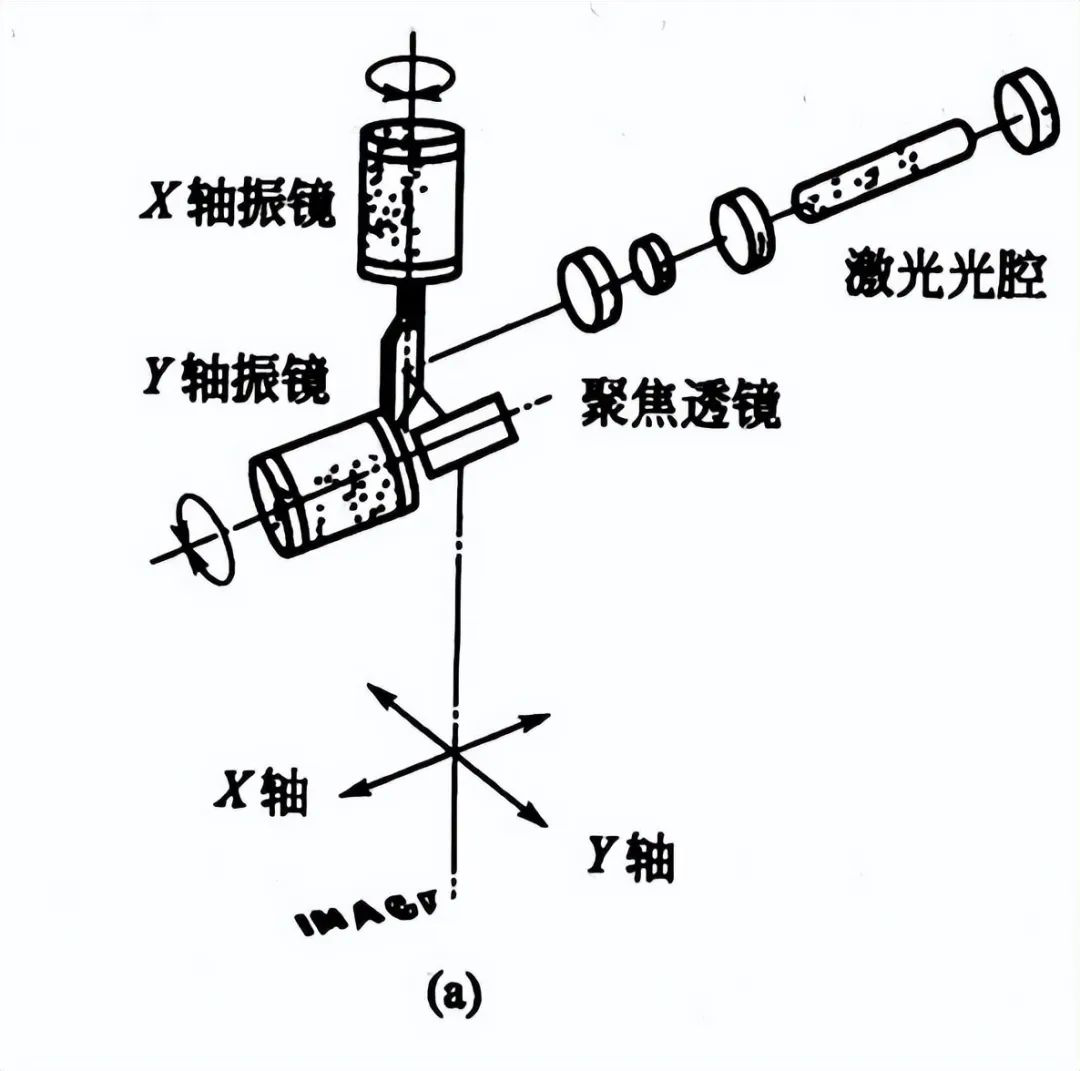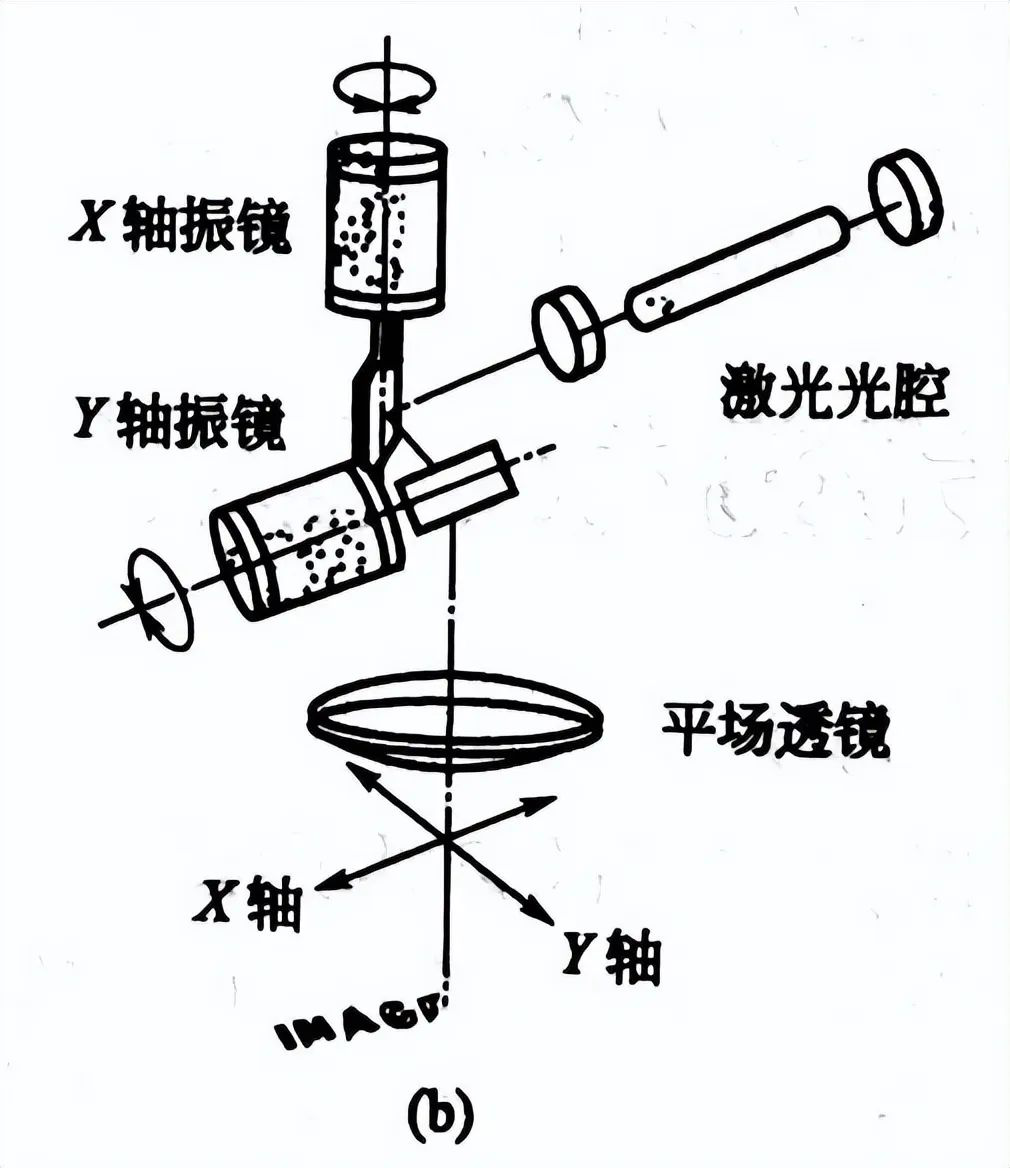 另一种是光束先经过振镜系统然后经聚焦镜再打到工件上,如下图所示。这种方法可在50mmx50mm或100mmx100mm的面积上进行标记,标记的面积可随意调整,可标记出各种复杂字符、图案以及图像。
