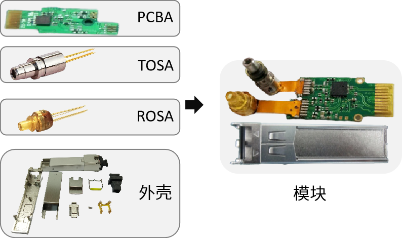 光收发一体模块由三大部分组成,它们分别是光电器件(TOSA/ROSA)、贴有电子元器件的电路板(PCBA)和LC、SC、MPO等光接口(外壳)。