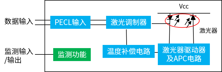 DATA与DATA的数据信号交流输出。并具有无光告警功能,当光功率不足以维持模块正常工作时,SD端产生逻辑低信号,产生告警。