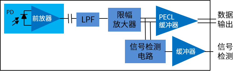 光接收部分以PIN为例,是由PINTIA(InGaAs PIN和跨阻放大器)和限幅放大器组成。将输入的光信号通过PIN管转换成光电流,光电流又通过跨阻放大器转换成电压信号。电压信号经限幅放大,并通过整形滤波器与限幅放大器产生差分