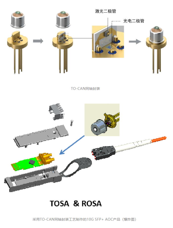采用COB工艺制作的10G SFP+ AOC产品(爆炸图)