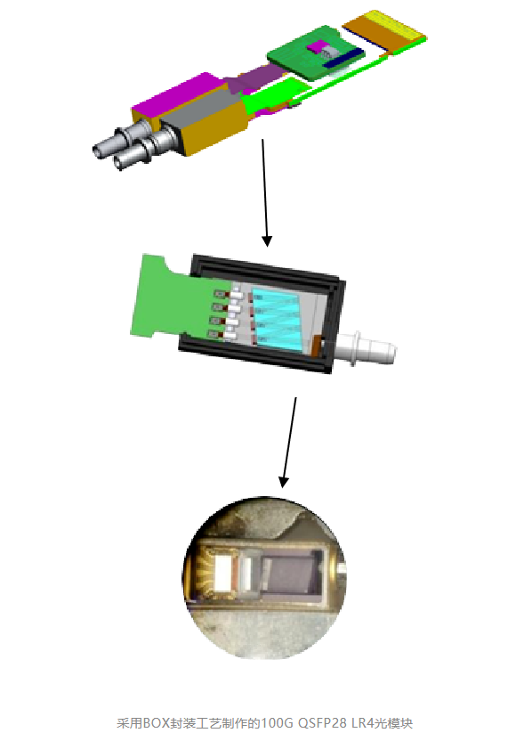 COB封装传统的单路10Gb/s或25Gb/s速率的光模块采用SFP封装将电芯片和TO封装的光收发组件焊接到PCB板上组成光模块。而100Gb/s光模块,在采用25Gb/s芯片时,需要4组组件,若采用SFP封装,将需要4倍空间。COB封装可以将TIA/LA芯片、激光阵列和接收器阵列集成封装在一个小空间内,以实现小型化。技术难点在于对光芯片贴片的定位精度(影响光耦合效果)和打线质量(影响信号质量、误码率)。