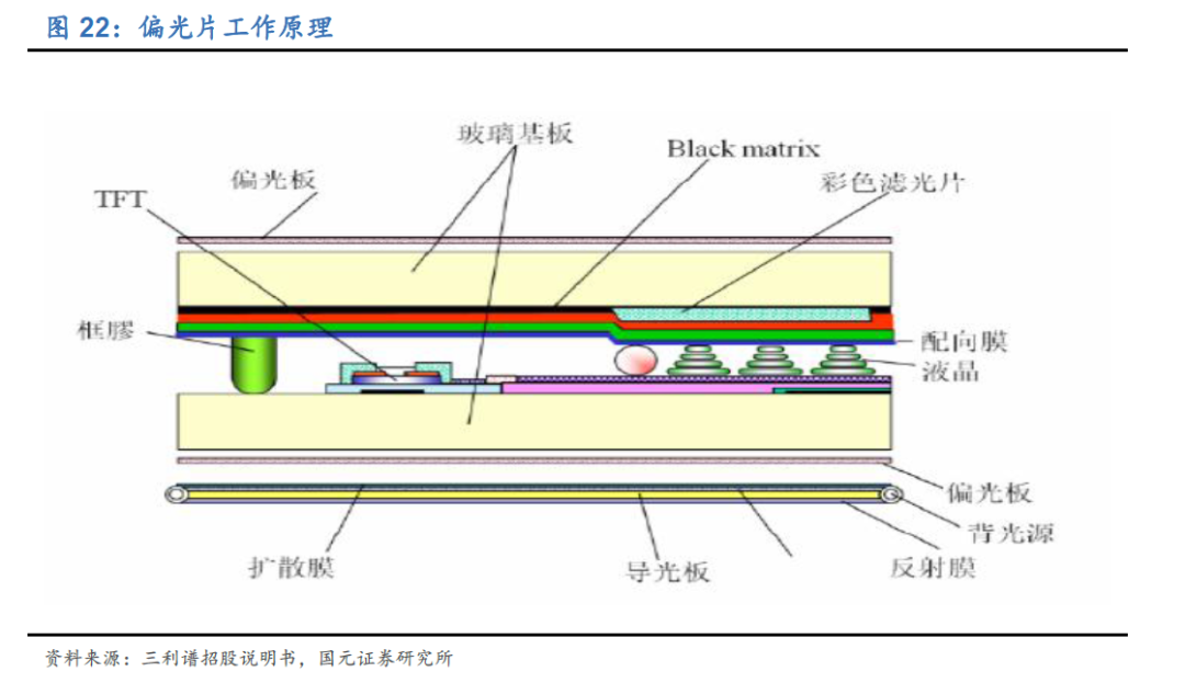 在 LCD 面板中需要用到两张偏光片,下偏光片将背光源发出的光束转换为偏振光, 上偏光片对偏振光进行解析,产生明暗对比,从而实现画面的显示。液晶显示必须 依靠偏振光,少了任何一张偏光片,液晶显示都无法显示成像。而在 OLED 面板中 需要用到一张偏光片,用来消除外界环境的反射光,保证显示的对比度足够高。