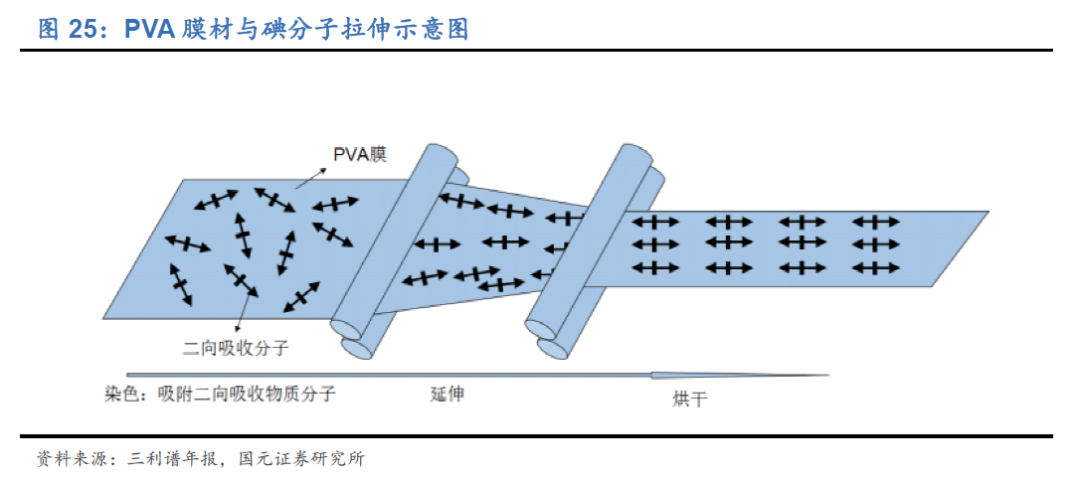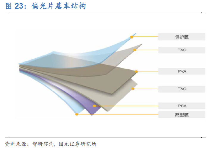 偏光片主要是由 PVA 膜、TAC 膜、保护膜、离型膜和压敏胶等复合制成,其中起偏振作用的核心膜材是 PVA 膜,该材料决定了偏光片的偏光性能、透光度、偏振度、 色调等关键光学指标。PVA 膜经过染色后吸附具有二向吸收功能的碘分子,通过拉 伸使得碘分子在 PVA 膜上有序排列,形成具有均匀二向吸收功能的偏光膜 ,其透 过轴与拉伸的方向垂直。