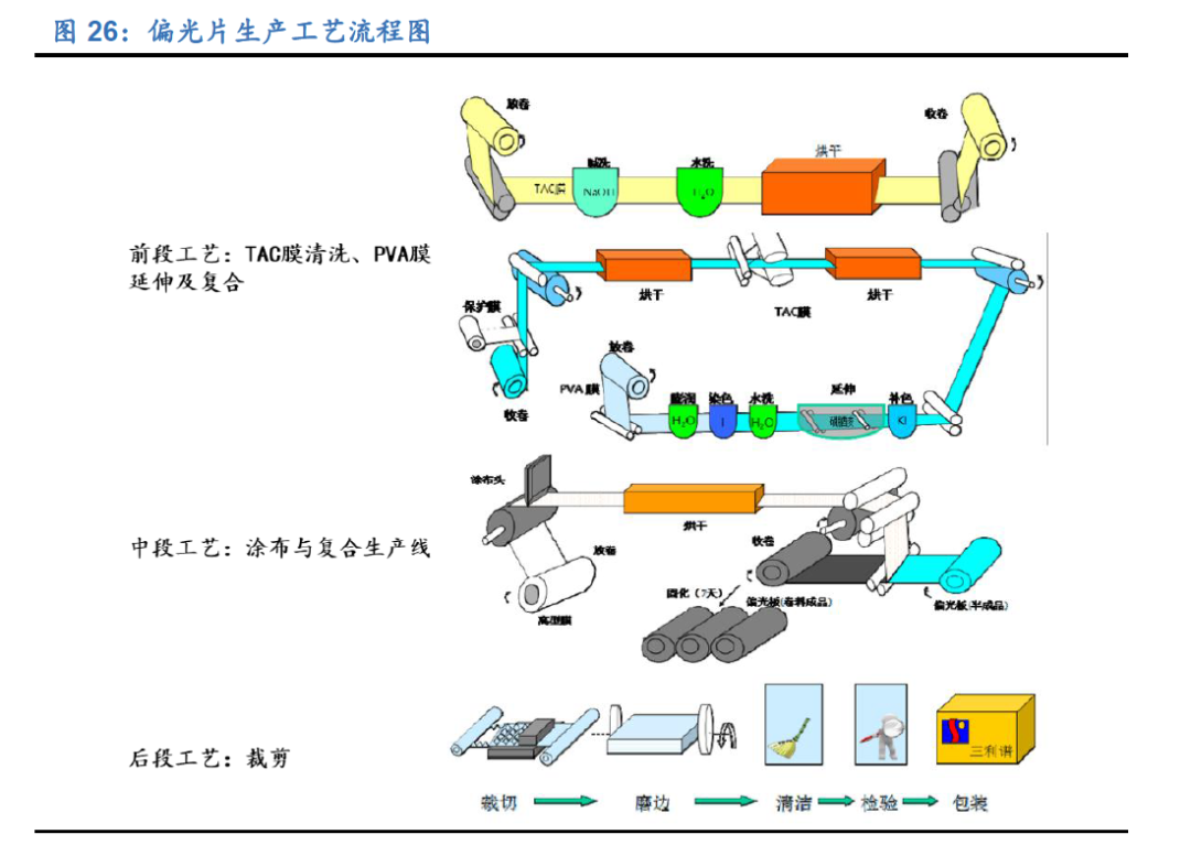 偏光片的主流生产工艺流程可以分为前、中、后三段工艺,其中前段工艺是偏光片 生产的核心环节。前段工艺包括对 TAC 膜的清洗和 PVA 膜的延伸及复合。将 TAC膜进行碱液处理,清洗之后烘干收卷,降低 TAV 膜的接触角。PVA 膜的延伸和复合是将 PVA 膜浸入染色槽,吸附二向吸收的碘分子,再进行拉伸取向,烘干后与 TAC 膜复合在一起,得到偏光膜。中段工艺是涂布压敏胶与复合离型膜等其他膜材的制程。后段工艺是将固化好的偏光片按照需要的尺寸大小进行裁剪、磨边、清洁、检验及包装。