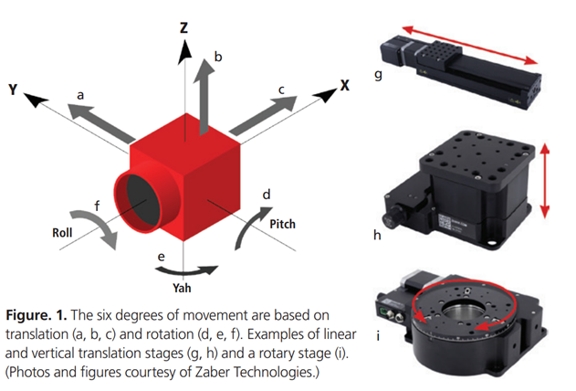 图1:基于平移(a、b、c)和旋转(d、e、f)的六个运动维度,以及线性和垂直平移台(g、h)和旋转台(i)示例。(图片来源:ZaberTechnologies)