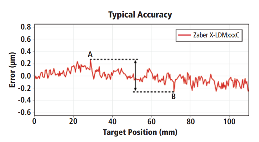 图3:线性平台的样本精度图。该图显示了平台在整个行程范围内的预期位置和实际位置之间的差异。可能的最大误差为0.6μm,即A点和B点之间的差值。