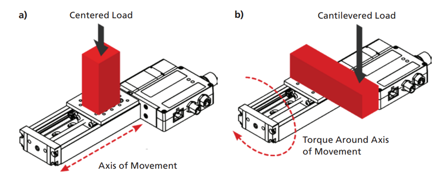 图5:中心载荷垂直于运动轴施加力(a),悬臂荷载围绕运动轴施加扭矩(b)。