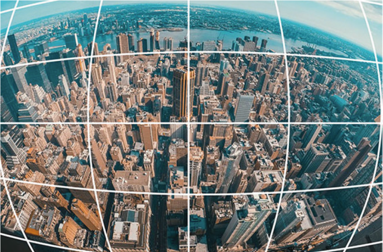 白色网格线的桶形失真显示了广角镜头扭曲对图像的影响
