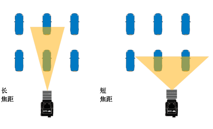 对于交通成像等需要将相机安装在被成像区域上方高处的应用(例如,在高速公路上方的柱子或龙门架上),安装高度对DoF有很大的促进作用。在高速公路上使用长焦镜头,能够在各种距离内对更多车辆进行成像。这种选项可能会限制相机能够准确成像的车道数量。图中比较了长焦镜头捕捉单个车道上的多辆汽车图像与广角镜头同时捕捉多个车道图像。调节为较小光圈,广角镜头可以捕捉到更远距离的细节,或者使用多台焦距更长的相机,可以捕捉到更多的汽车图像。镜头的最佳选择取决于若干因素,包括但不限于相机的帧率、环境条件以及可覆盖的车道数。因此,根据相机的部署位置,应考虑采用各种焦距以找到最佳视觉解决方案。