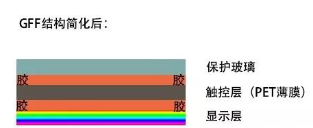 为什么说 GFF是伪全贴合工艺呢? 因为GFF屏幕依然是由保护玻璃、触控层和显示层三个独立层组成的,其 触控层仍然独立存在。只是 GFF工艺直接将上面非全贴合方式中间触控层玻璃换为PET薄膜,并用光学胶(水胶)完全将空气层填充。