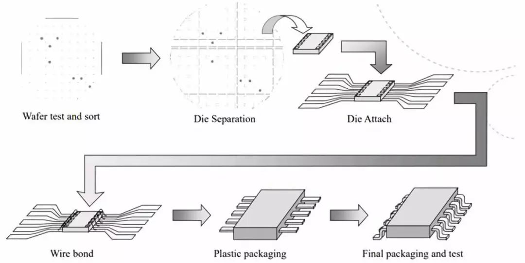 传统电子封装从最初的三极管直插时期后开始产生,其过程如下:将圆晶切割为晶粒(Die)后,使晶粒贴合到相应的基架板触垫(Leadframe Pad)上,再利用导线将晶片的结合焊盘与基板的引脚(Wire Bond)相连,实现电气连接,最后用外壳小心加以保护。典型的封装方式有:DIP,SOP,BGA等。