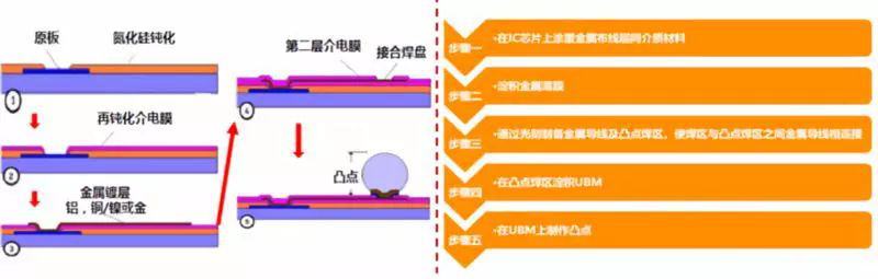 在WLP技术中有两大关键工艺:①薄膜再分布技术;②焊料凸块制作技术(Bumping)。其中薄膜再分布技术至在IC晶圆片上,将各个芯片按周边分布的的I/O焊区,通过薄膜工艺的再布线,变换成整个芯片上的阵列分布焊区,并形成Bumping的技术。主要再分布步骤及技术流程如下所示。