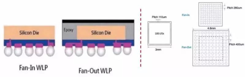 传统的晶圆级封装(Fan-in WLP),其I/O数受到芯片面积限制,适用于低引脚数的消费型集成电路封装。随着集成电路信号输出引脚数目的增加,焊锡球的尺寸也变得越来越严格,PCB对集成电路封装后尺寸以及信号输出接脚位置的调整需求得不到满足,因此衍生出了扇出型圆晶级封装。
