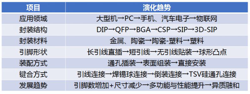 从上述封装发展历程上看,封装结构主要沿着DIP→QFP→BGA→CSP→3D-SiP方向演进。封装结构演化过程中封装材料、引脚形状、装备方式以及键合方式也发生了相应的变化,主要趋势详见下表。