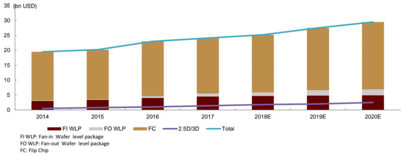 先进封装产值占封装总产值近一半,将引领未来发展。从全球封测市场产值看,据Yole数据显示,2017年先进封装产值超过20亿美元,占全球封测总产值近一半市场。先进封装由于可以提高封装效率,降低封装成本,提供更好的封装性价比,将是未来封测行业的主要发展方向。