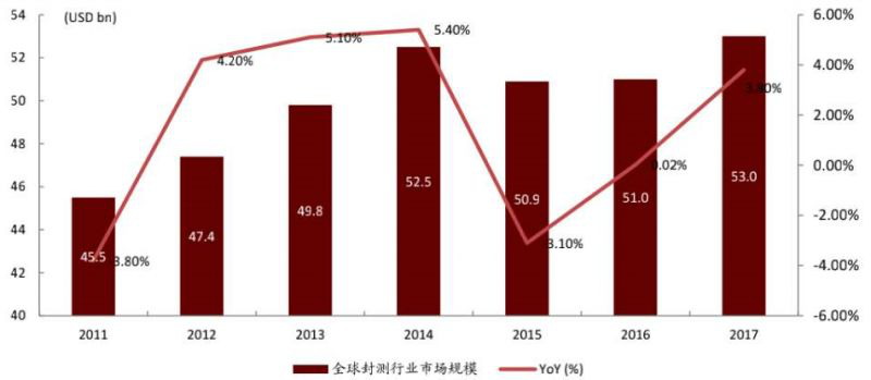 电子封装行业属于半导体产业链的下游,位于圆晶制造之后,电子制造电路组装之前,是半导体行业链的必要一环。近年来,全球封测市场稳步增长,根据Gatner数据统计,2017年全球半导体行业收入4204亿美元,同比增长21.6%,其中封测行业收入占533亿美元,同比增长7.0%,占半导体行业收入的13%。