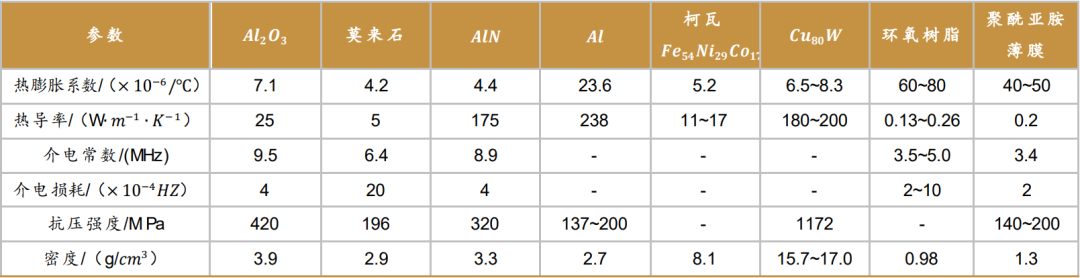 对于集成电路等半导体器件来说,封装基板需要满足以下六点要求:(1)高热导率,器件产生的热量需要通过封装材料传播出去,导热良好的材料可使芯片免受热破坏;(2)与芯 片材料热膨胀系数匹配,由于芯片一般直接贴装于封装基板上,两者热膨胀系数匹配会降低芯片热应力,提高器件可靠性;(3)耐热性好,满足功率器件高温使用需求,具有良好的热稳定性;(4)绝缘性好;(5)机械强度高,满足器件加工、封装与应用过程的强度要求;(6)价格适宜,适合大规模生产及应用。