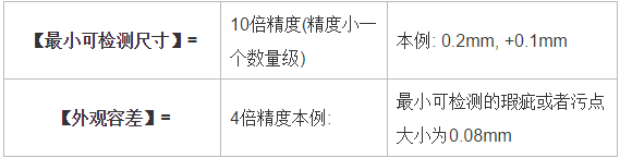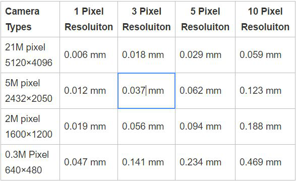 精度的单位是mm。根据产品表面和照明状况的不同,我们可以通过放大图像观察辨别稳定像素的个数,从而得出精度。如果条件不允许实际测试观察,一般的规律是,如果使用正面打光,有效像素为1个,使用背光,有效像素为0.5个。