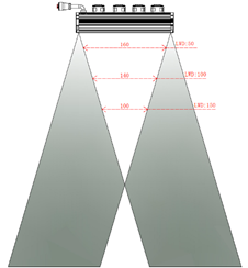 传统线形光源,多应用于高速大幅面样品的识别、定位、缺陷检测及尺寸测量等检测项。在划痕类的缺陷检测中,如果使用传统的线形光源,只能检测出“横向缺陷”,而“纵向缺陷”则难以被发现。为了让“纵向缺陷”也无处遁逃,沃德普推出了交叉线形光源。它利用特殊的光学设计,使两侧的光线呈一定角度汇集到光源中间位置,凸显纵向缺陷,通过降低背景亮度来提升缺陷的对比度。图2为交叉线形光源的照明光斑与工作距离关系的示意图。