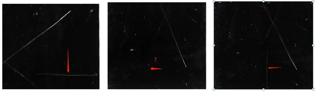 (a) 普通线光检测“横向划痕” (b) 普通线光检测“纵向划痕” (c) 交叉线光检测“纵向划痕”