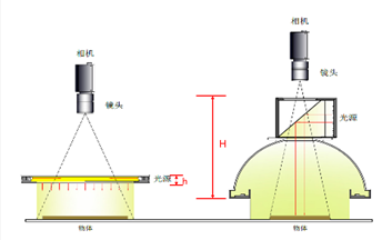 平面无影光源能提供高均匀度的漫射照明,可以消除产品表面不平整形成的干扰,成像效果与“圆顶+同轴光源组合”类似,且相比于组合光源而言,更节省空间。图5为两组光源的成像原理图,左侧为平面无影光源,右侧为“圆顶+同轴”的组合光源。