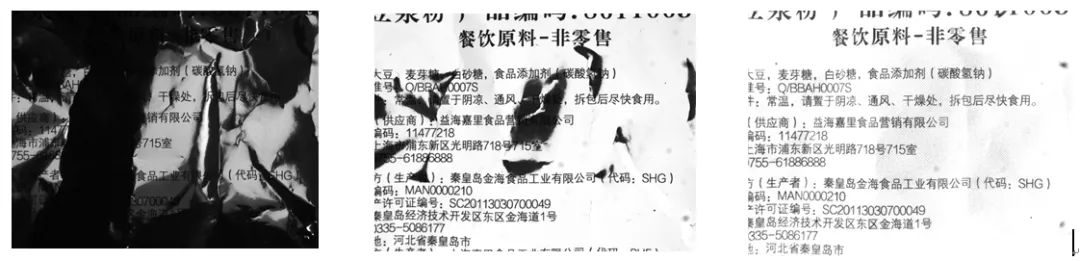 在检测表面不平整的物体时,如塑料等材质柔软的包装袋表面,推荐使用平面无影光源。图6为手机拍摄的食品包装袋样品,图7的(a)、(b)、(c)分别为同轴光源、圆顶光源、平面无影光源对食品包装袋上的字符的检测效果对比。