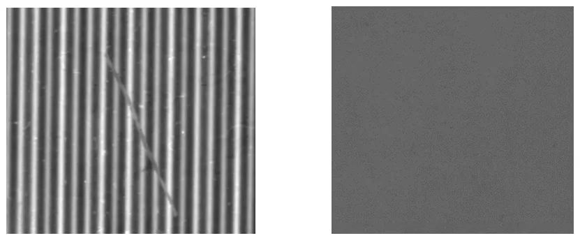 案例2:偏光膜表面变形与凹凸点检测。图11为平面条纹光源的成像图。(a)为平面条纹光源检膜材“变形”的效果,(b)为平面条纹光源检“凹凸点”的效果,可以看到检测图片中有缺陷的地方条纹明显形变,不再呈现出平行的特征。
