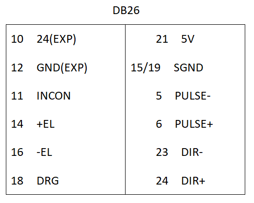 第二种:只接DB26上面的针脚,接10、12、11、14、16、18、5、6、23、24 十个针脚,确认针脚10(24v)、针脚12(0v)、针脚11(公共端)、针脚14(正限位)、针脚16(负限位)、针脚18(原点)是否接好接对,板卡上端口就不用接任何线了