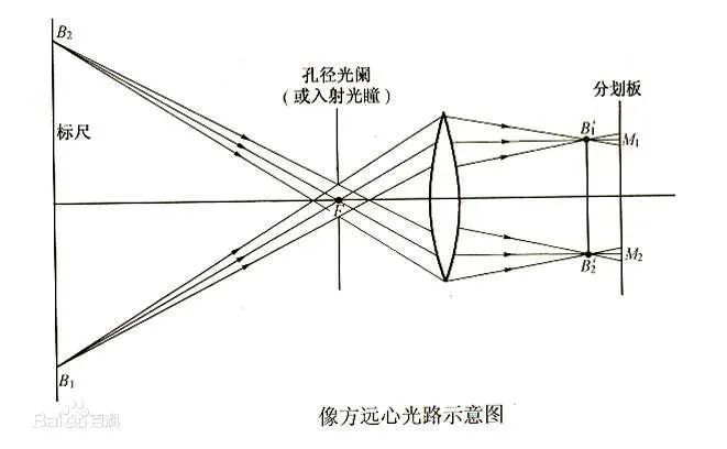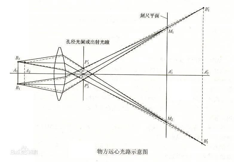 1).物方远心光路是将孔径光阑放置在光学系统的像方焦平面上,物方主光线平行于光轴主光线的会聚中心位于物方无限远,称之为:物方远心光路。其作用为:可以消除物方由于调焦不准确带来的,读数误差。