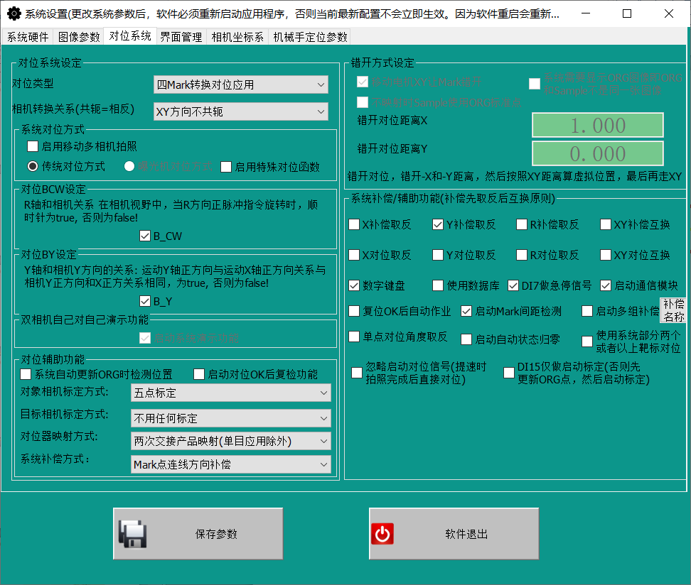 实现原理是在标定和映射时,软件记录设备相机各轴的坐标位置和搬运轴拍照位置、贴合位置等位置信息。此时做好标定和映射的数据的设备各轴位置数据作为标定时的原始位置信息,此后调试各轴位置,通知软件修改生产时的各轴位置,在对位关系上做出算法补偿计算,实现改变各轴改变位置后的贴合对应关系不变。