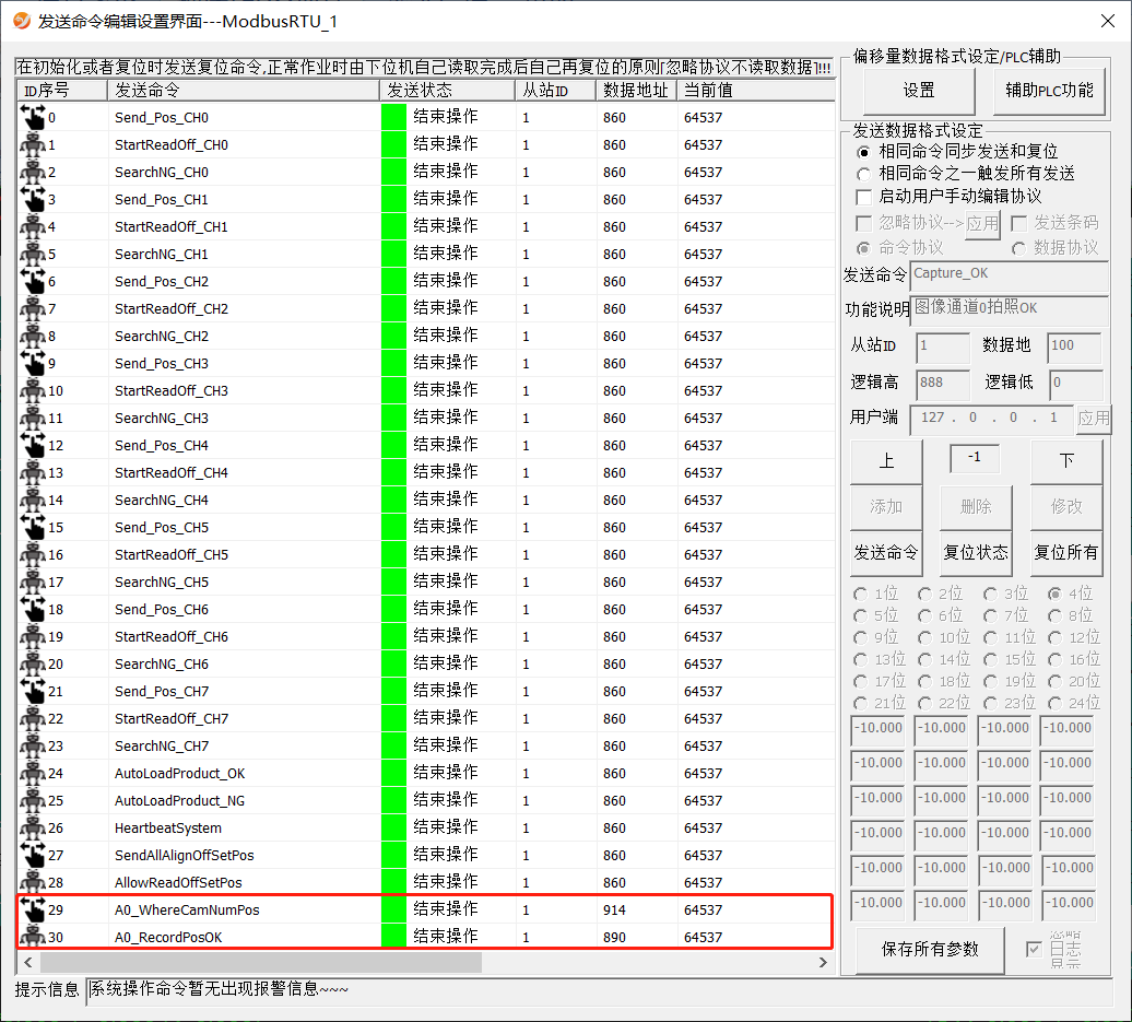 为了方便各轴修改位置后的数据及时写入视觉软件,PLC修改各轴位置后通过通讯发送给视觉软件。