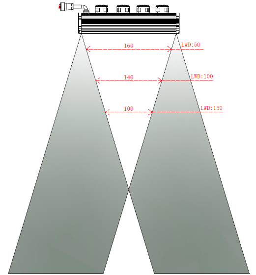 为了让“纵向缺陷”也无处遁逃,可采用交叉线形光源。它可利用特殊的光学设计,使两侧的光线呈一定角度汇集到光源中间位置,凸显纵向缺陷,通过降低背景亮度来提升缺陷的对比度。