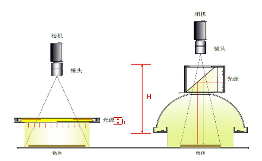 下图为两组光源的成像原理图,左侧为平面无影光源,右侧为“圆顶+同轴”的组合光源。