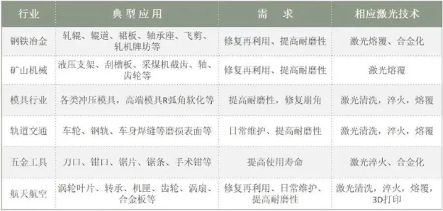 当前,激光表面处理及增材制造技术、工艺和装备被广泛应用于冶金、矿山机械、模具、石油电力、五金工具、轨交、航空航天、机械等行业。